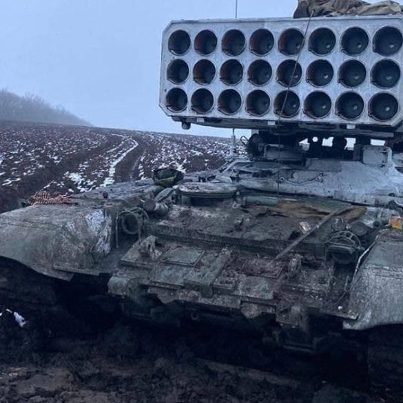 Українські захисники опублікували відео, зняте між Бахмутом і Костянтинівкою, де у колоні військової техніки ЗСУ їде трофейний російський ТОС-1А «Солнцепек»....